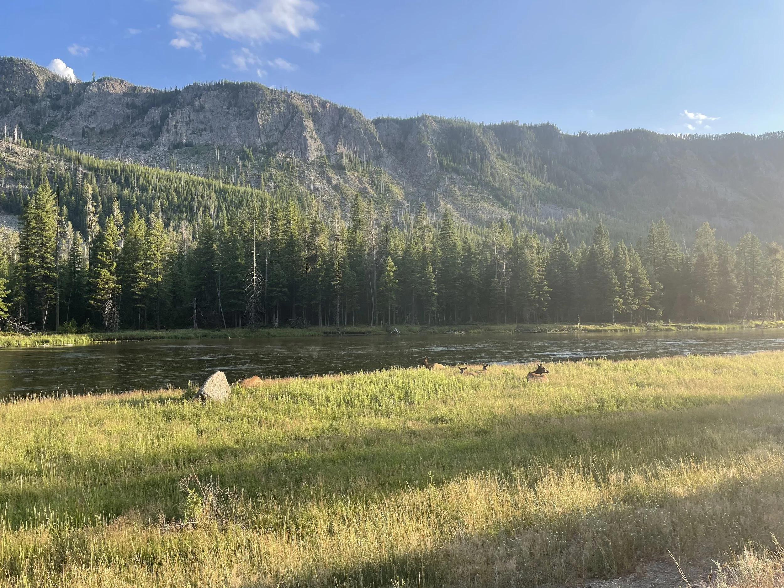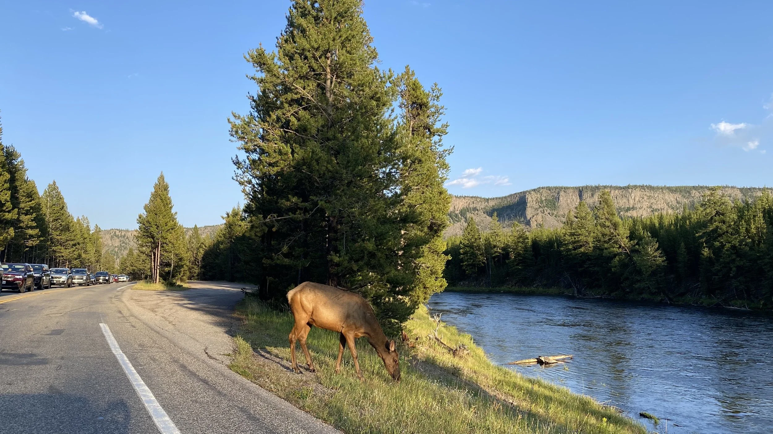 The first real encounter that we had in Yellowstone was a bunch of elk off to the side by a river. Pretty quickly after that we almost ran into another elk that was slowly meandering across the road. We were very glad to be on our side of the road, because the other side of the road was blocked up for at least a mile, since everyone stopped to look at the elk. We continued on, passing car after car and thinking just how lucky we were that we weren’t trying to leave the park through the west entrance.