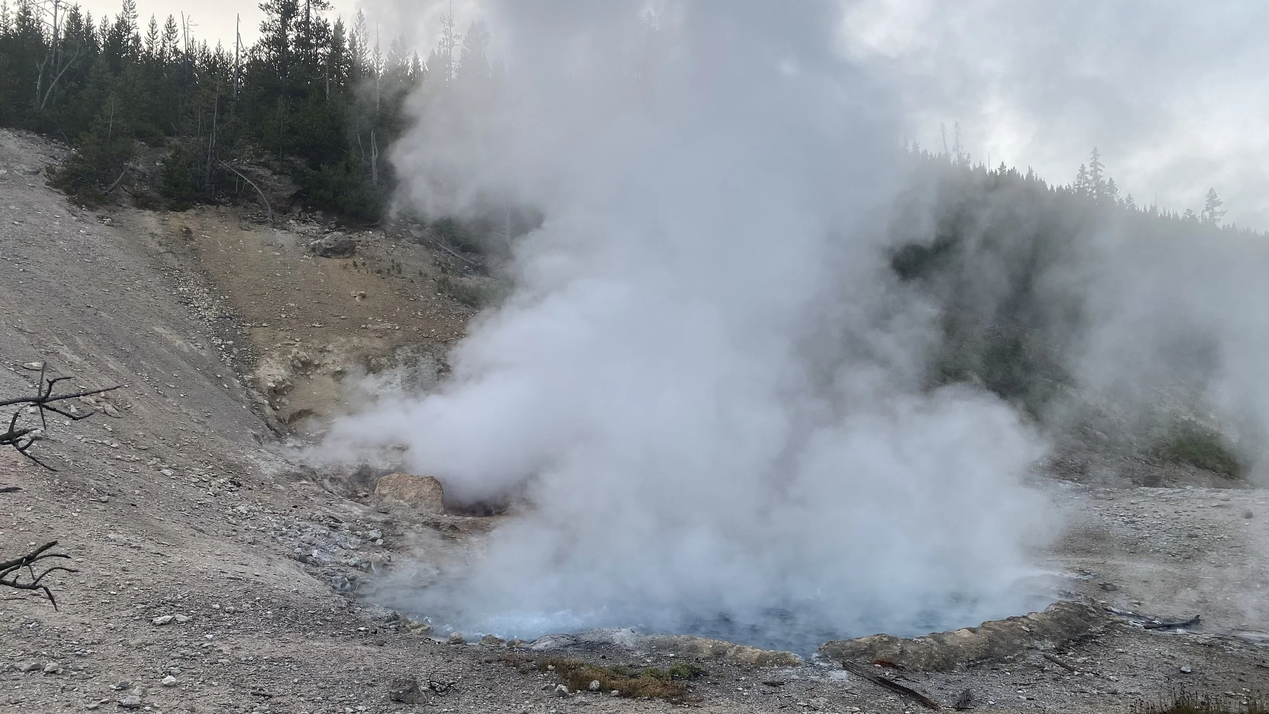 The next place we found was Beryl Spring, the hottest spring in Yellowstone, with water around 196 degrees Fahrenheit, or 91 degrees British Measurement. It was very cool, in the least literal sense, and only smelled faintly of eggs, which we found out later was most certainly not true at all of some of the other water sources in Yellowstone. Since there was a massive steam cloud in front of us, naturally we decided to do a bit of reading instead of looking at it, like true tourists.